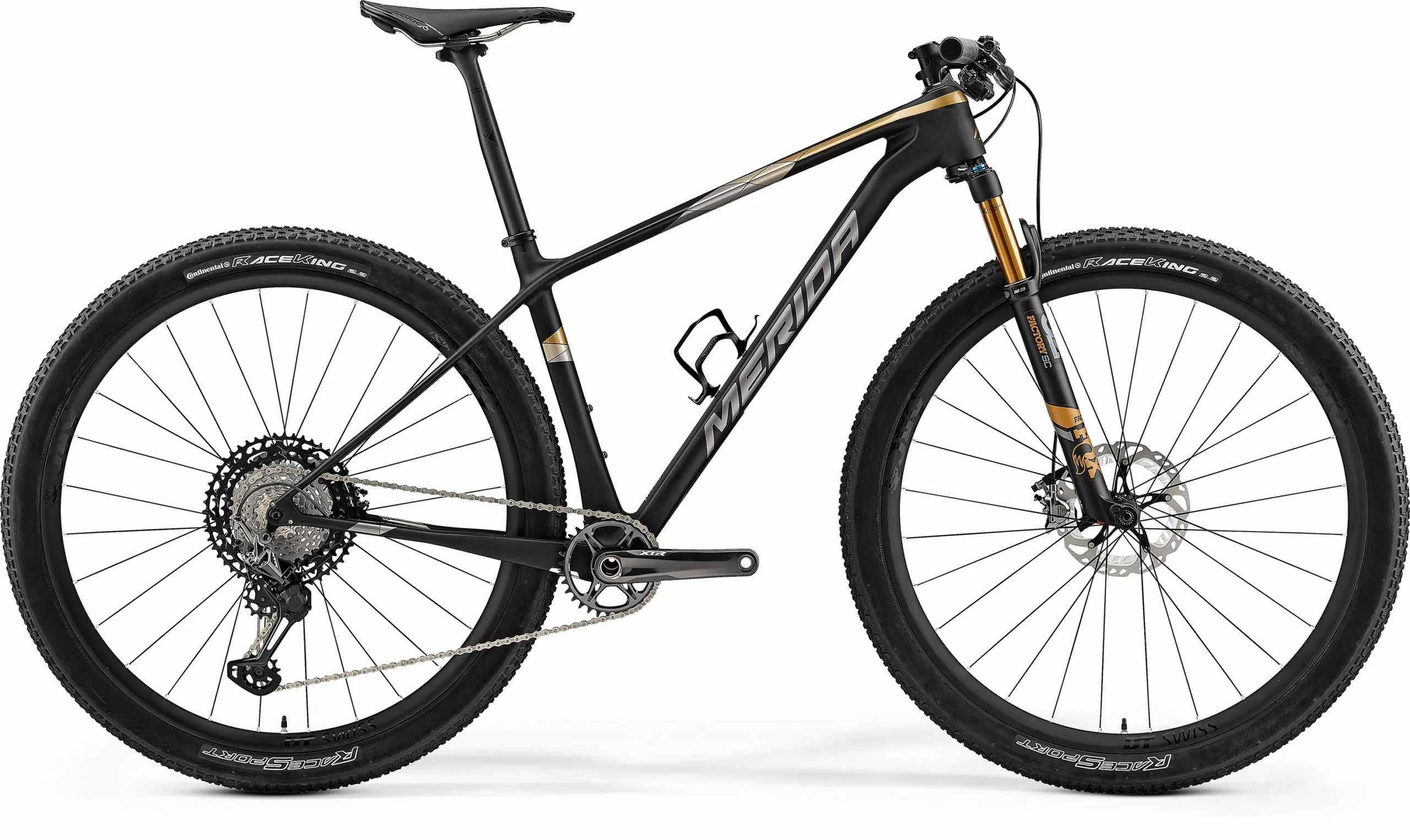 Stel: Big.Nine CF5. Forgaffel: Fox Factory 32 float SC, air, 100 mm, remote lockout. Kranksæt: Shimano XTR, 34T. Gear: 12. Skiftegreb: Shimano XTR. Bagskifter: Shimano XTR Shadow+. Bremser: Shimano XTR. Fælg: DT Swiss XRC 1200 Spline 25 (110×15 / 148×12). Dæk: Continental Race King 2,2 Race Sport, folde. Kassette: Shimano XTR, 10-51. Kæde: Shimano M9100. Styr: Merida Team CC 720 mm, flat. Frempind: Merida Team CC. Sadel: Prologo Scratch 2. Sadelpind: Merida Team CC, 30.9 mm, carbon. Farve: Mat UD carbon (skinnende guld). Størrelser: M(17,5”)-L(19”). Vægt: 8,4 kg. Anb. pris: 54.998,00.